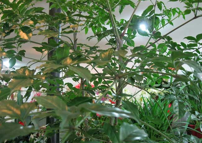 幸福樹高達(dá)10米。葉柄、葉軸、花序均無毛。2回羽狀復(fù)葉,稀為3回羽狀復(fù)葉,葉軸長約30厘米左右。小葉卵形至卵狀披針形,長4-7厘米,寬2-3.5厘米,頂端尾狀漸尖,基部闊楔形,全緣,側(cè)脈5-6對,向上斜伸,兩面均無毛,側(cè)生小葉片在近基部的一側(cè)疏生少數(shù)盤菌狀腺體。側(cè)生小葉柄長在5毫米以下,頂生小葉柄長1-2厘米。