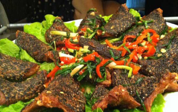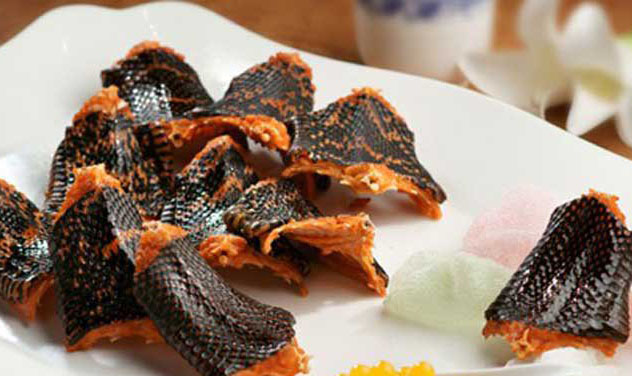 【做法】①將大王蛇斬頭放血洗凈,斬成長段,用調(diào)料腌漬入味。②油鍋上火滑油,留底油待油溫升至六成熱時(shí),下大王蛇段浸炸至基本熟,撈起,待油溫升至七成熱時(shí)再氽炸一遍,使之炸熟呈金黃色,撈出裝盤,撒上椒鹽即可。