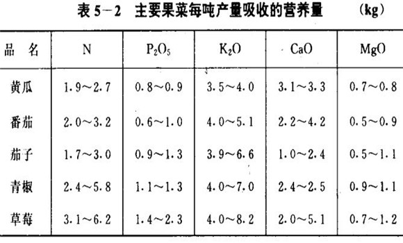 應(yīng)該指出,根據(jù)作物對(duì)養(yǎng)分的吸收比例及產(chǎn)量來(lái)確定的養(yǎng)分吸收量只是一個(gè)大致范圍,并不能因此消除各個(gè)作物之間對(duì)不同元素吸收所存在的差異,如主要果菜品種間養(yǎng)分吸收量的差異(表5—2),而且各種蔬菜作物之間經(jīng)濟(jì)產(chǎn)量系數(shù)也有差別,在決定養(yǎng)分吸收量時(shí)還應(yīng)注意作物產(chǎn)量的不同。